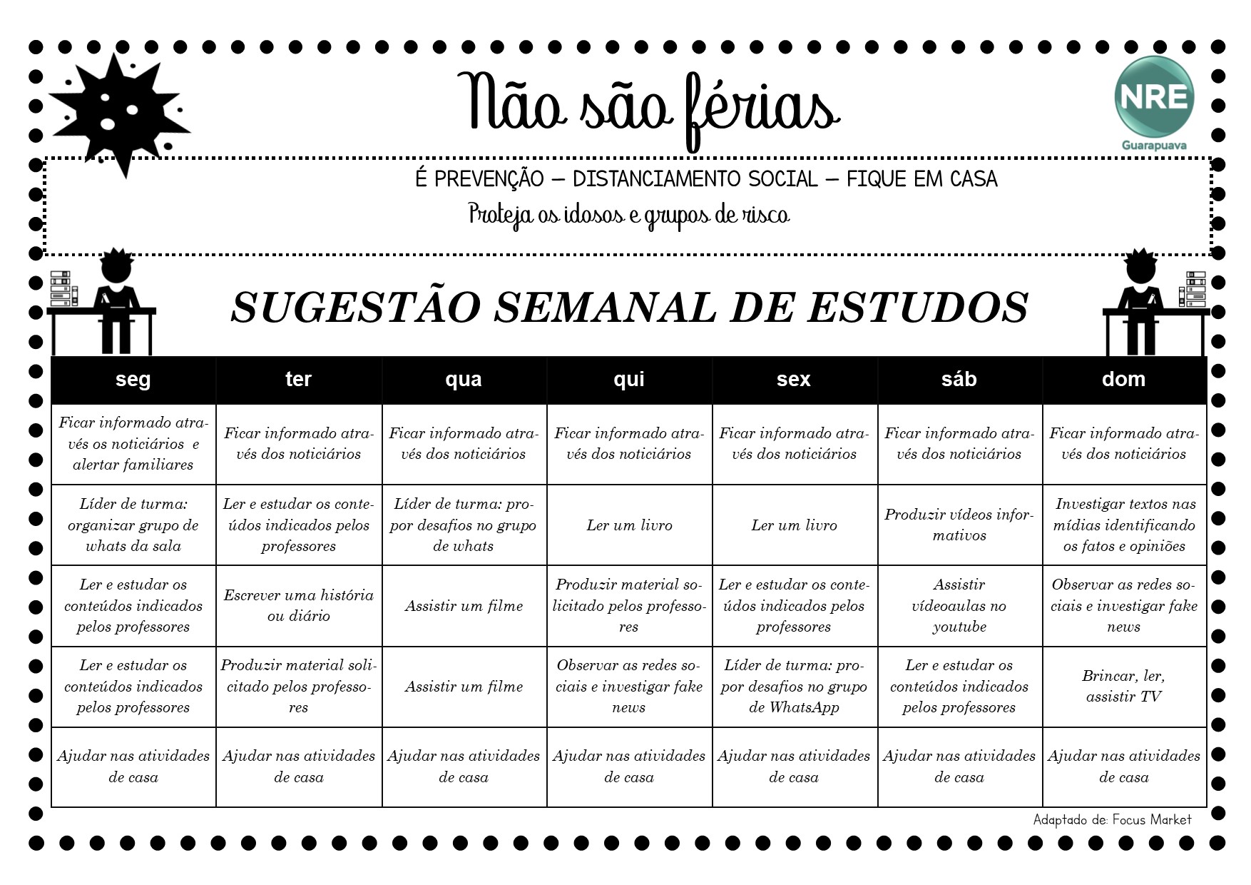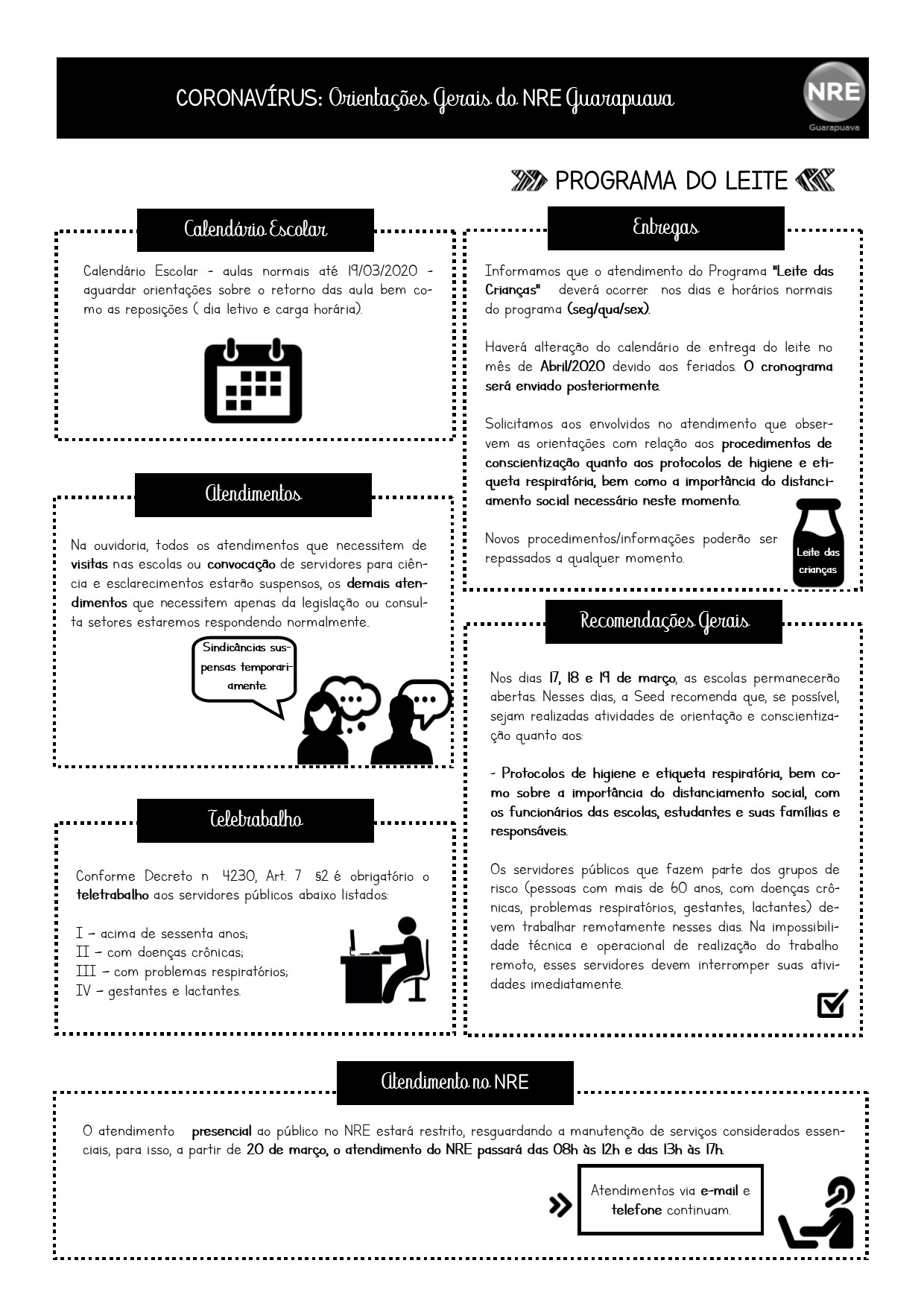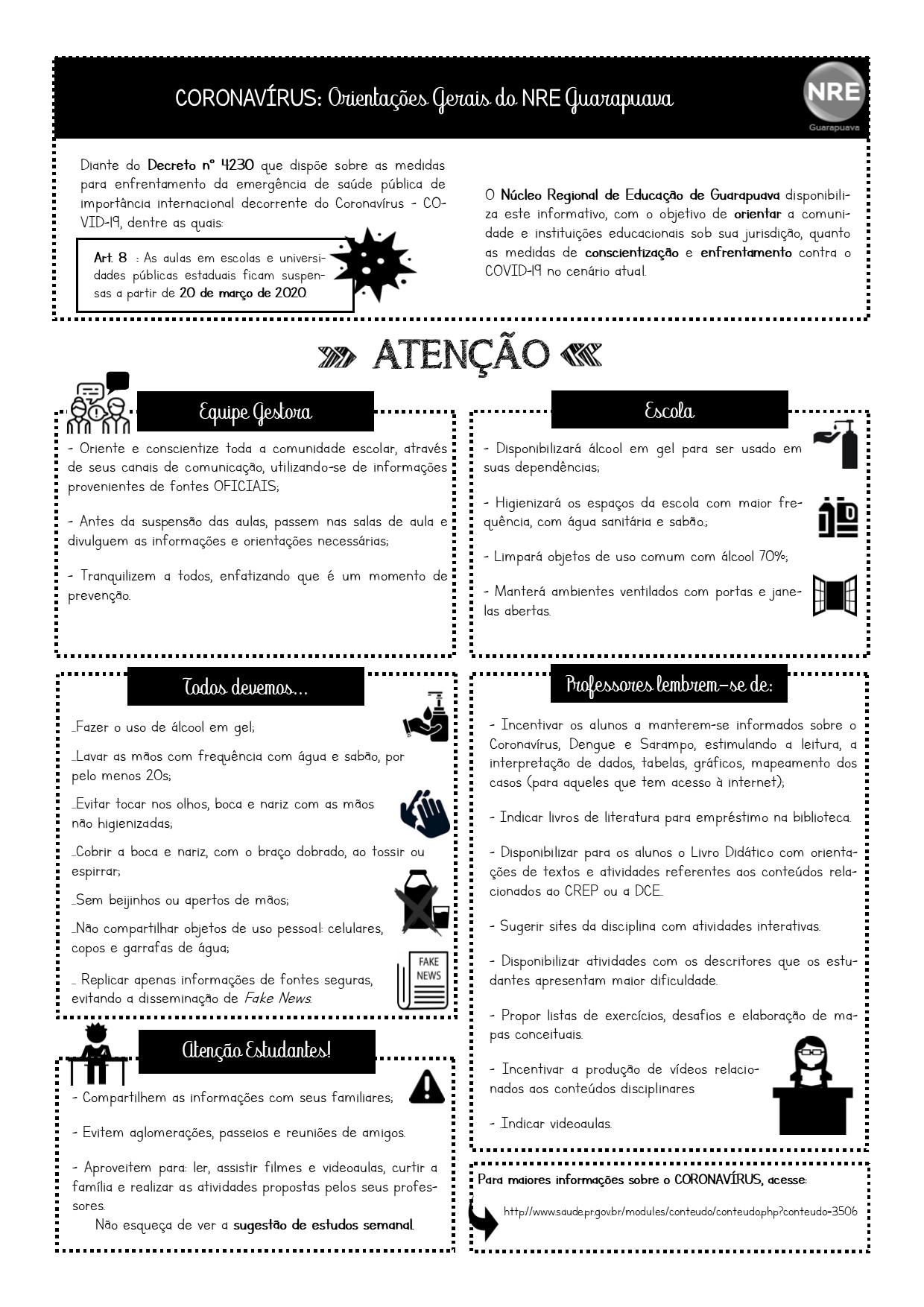 O Núcleo Regional de Educação de Guarapuava disponibiliza o informativo a seguir, com o objetivo de orientar a comunidade escolar e as instituições educacionais sob sua jurisdição, quanto as medidas de conscientização e enfrentamento contra o COVID-19 no cenário atual.