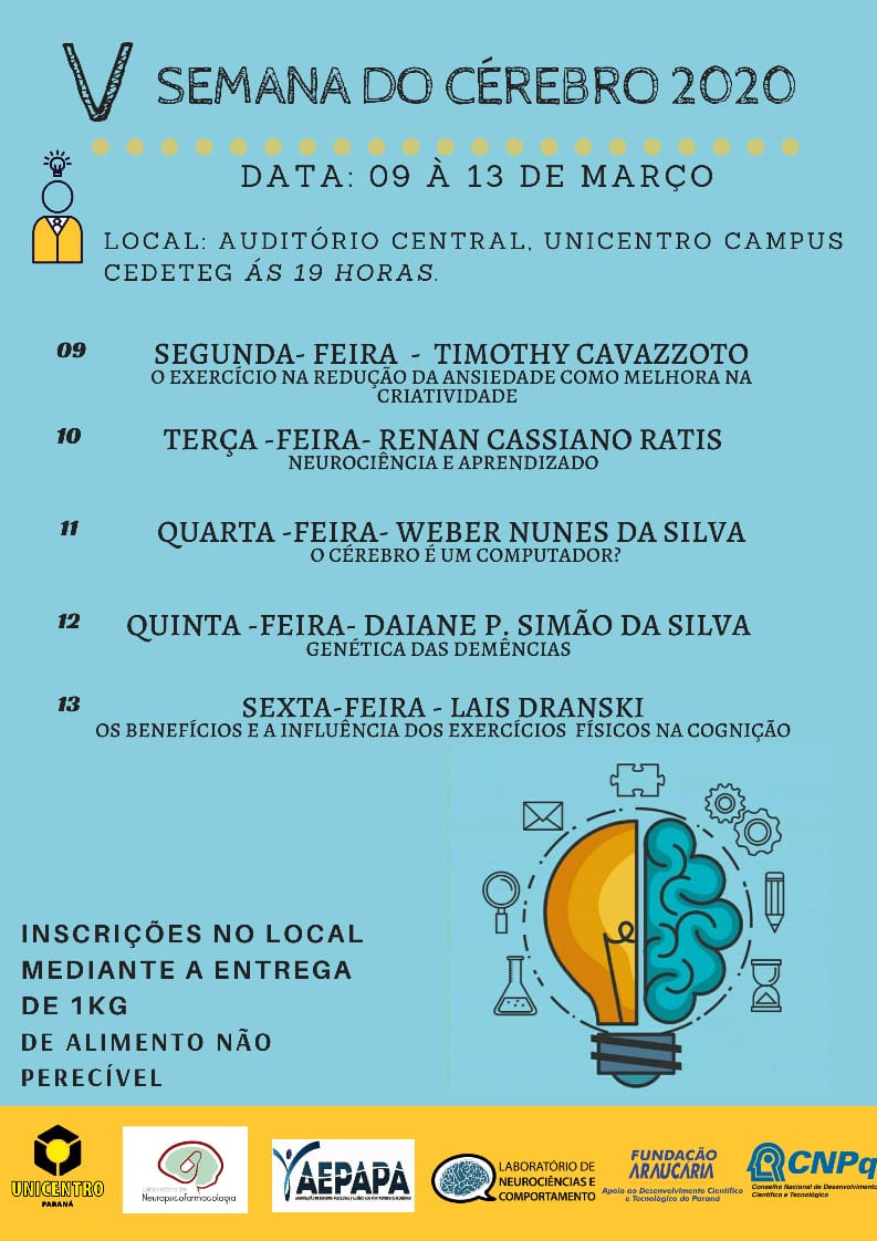 A Universidade Estadual do Centro Oeste - UNICENTRO convida a comunidade para participar da V Semana do Cérebro 2020, que acontecerá nos dias 09 à 13 de Março no campus Cedeteg.